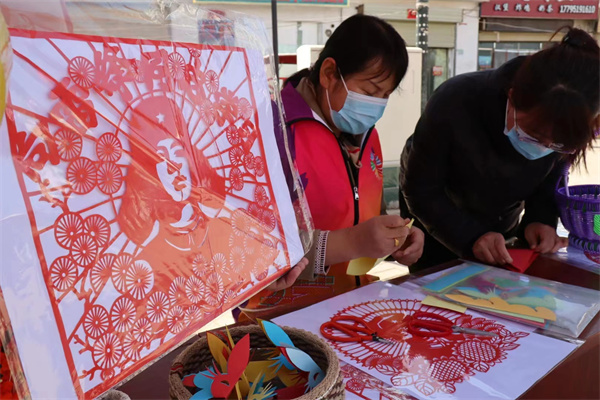宁夏民协组织文艺小分队在陶乐镇为月牙湖村民发送剪纸作品