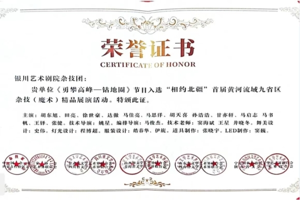 10月26日和27日晚上,内蒙古艺术剧院音乐厅传来一阵阵热烈的掌声,精品展演活动正式拉开帷幕,来自九省区的专业杂技演员与中国台湾的魔术演员胡凯伦的魔术12个精品节目为观众送上一场震撼的杂技魔术表演,剧场掌声不断,气氛热烈。由宁夏曲艺杂技家协会选送,银川市艺术剧院杂技团表演的杂技节目《勇攀高峰——钻地圈》经过层层选拔参加了此次展演,受到观众热烈欢迎。由宁夏曲艺杂技家协会副秘书长吕薇编导、山东济宁杂技团表演的杂技《坛三彩》也被山东省选送参加了此次展演。