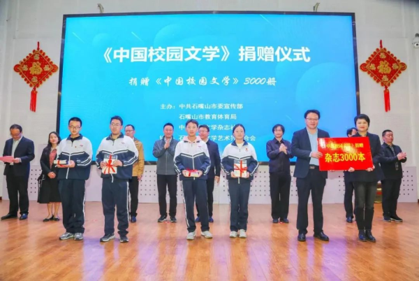 活动现场,《中国校园文学》向石嘴山市第三中学授予“中国校园文学重点基地学校”,并向石嘴山市各中小学校捐赠《中国校园文学》3000册。