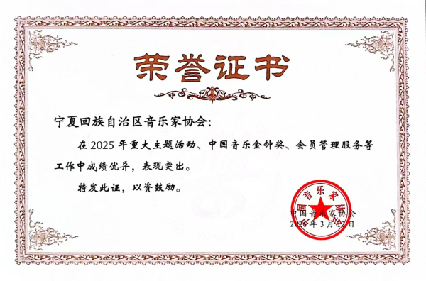 会上,宁夏音乐家协会因在2025年重大主题活动、中国音乐金钟奖、会员管理服务等工作中成绩优异、表现突出,受到表彰,并获颁荣誉证书。
