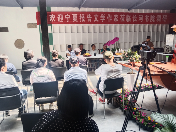 当天,作家们在长河书院进行了“文化助力 乡村振兴”报告文学创作座谈会,并向书院乡村公益图书馆赠送图书和书法作品。