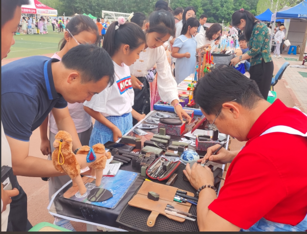 在银川市兴庆区第四小学、银川市景博学校,民间文艺家安宇歌进行口弦知识讲座及现场表演,与此同时,汪卫荣的贺兰砚现场篆刻、牛红霞的“蝴蝶”剪纸展示、冯刚的“仕女”面塑制作、王语晗的“动物园”扎染作品,让孩子们眼花缭乱、爱不释手,他们围在老师们身边,体验且感受着非遗的魅力,“一字”摆开的体验区为学校的跳蚤市场增添了一抹亮丽的风景线。