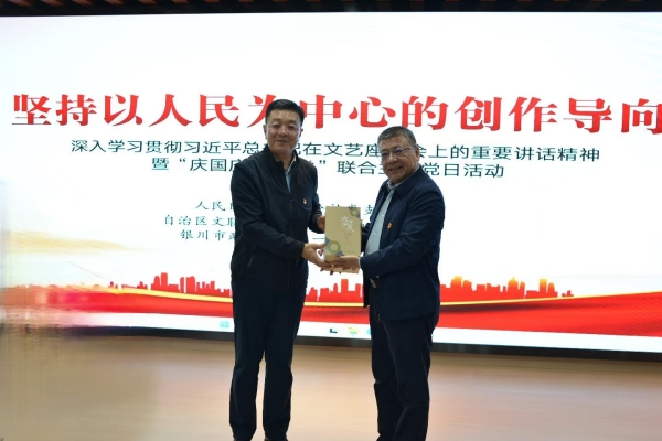 活动中,自治区文联党组书记、副主席黄明旭介绍了宁夏文联特色亮点工作,人民日报社宁夏分社社长徐元锋交流了陪同人民日报社社长、总编辑于绍良调研西海固文学时的感悟,自治区文联行业管理与维权部主任杨春介绍了宁夏文艺志愿服务工作,宁夏作家协会副主席李金瓯介绍了宁夏文学与西海固文学发展情况,银川市政协文化文史和学习委员会主任代晓宁介绍了银川市政协协商民主实践中心文化建设工作。自治区文联分别向人民日报社宁夏分社、银川市政协协商民主实践中心赠送了书法作品和文学书籍。自治区文联第四党支部书记闫宏伟主持活动。
