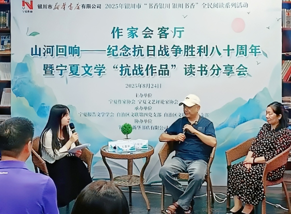 为纪念中国人民抗日战争暨世界反法西斯战争胜利80周年,8月24日,由宁夏作家协会、宁夏文艺评论家协会主办,宁夏报告文学学会、宁夏文联第四及第六党支部承办,银川市新华书店有限公司协办的“山河回响——纪念抗日战争胜利80周年暨宁夏文学‘抗战作品’读书分享会”在银川成功举办。宁夏作家协会主席团委员、宁夏报告文学学会秘书长张九鹏,石嘴山市作家协会原副主席马丽华,宁夏作家协会报告文学学会理事、专栏作家郑文著,民革党员、抗战军人金忠仁之孙金川以及宁夏文联第四、第六党支部的党员等参加了此次活动。活动由宁夏文艺评论家协会副秘书长王嘉俐主持。